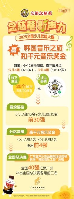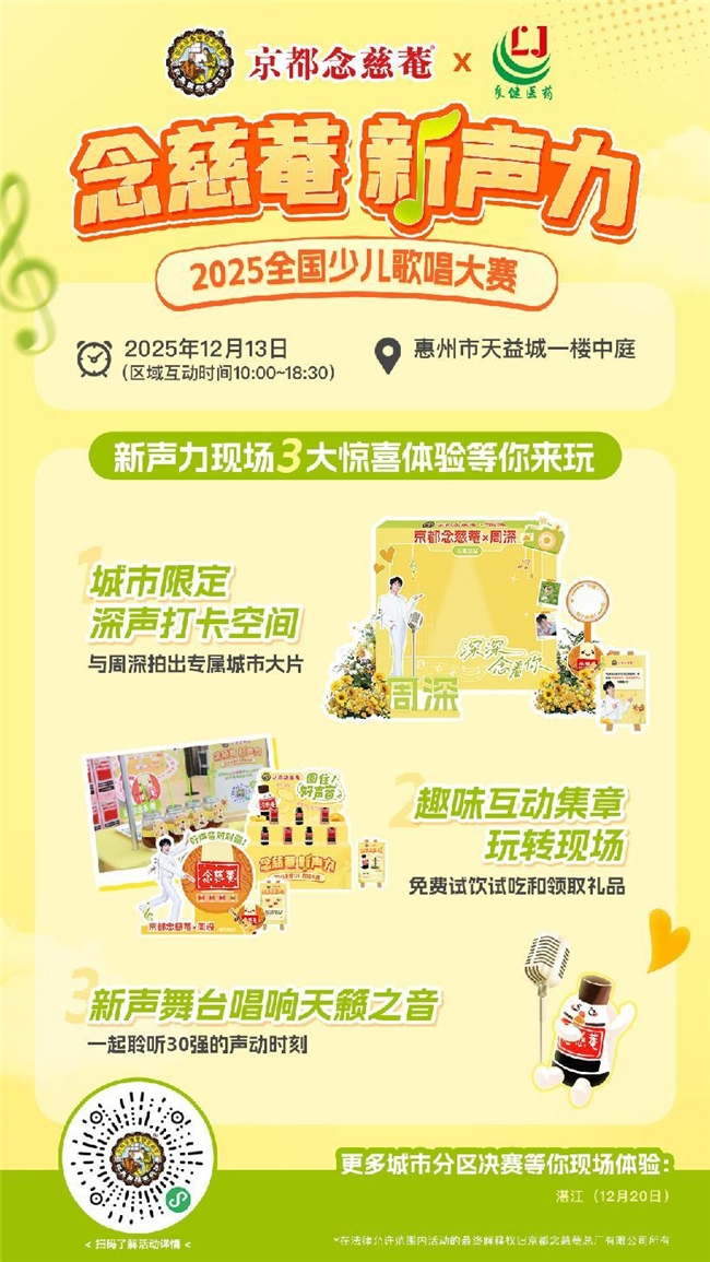 百年护喉品牌京都念慈菴再度打造少儿音乐盛宴,让怀揣音乐梦想的孩子站上闪耀舞台。自9月启动以来,第三届“念慈菴新声力”少儿歌唱大赛已走过全国多座海选城市,如今,这场童声与梦想的旅程,即将迎来关键节点——惠州分区决赛将于12月13日在惠州隆重举行! 30名小歌手从同赛区的报名者中突围而出,他们将在分区决赛的舞台上展开激烈角逐,绽放音乐的魅力,争夺全国总决赛的黄金席位,向韩国音乐之旅大奖出发。